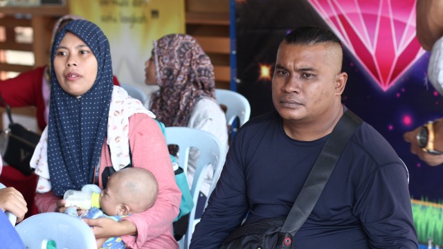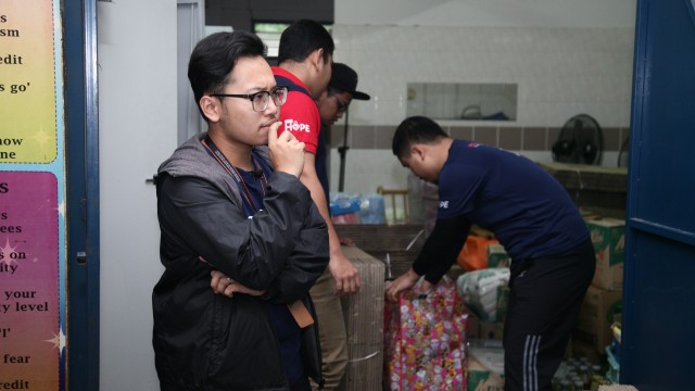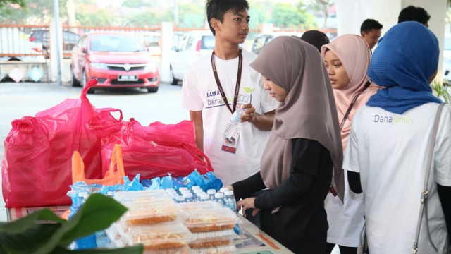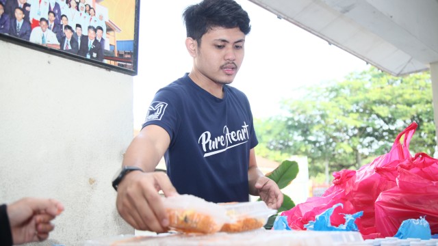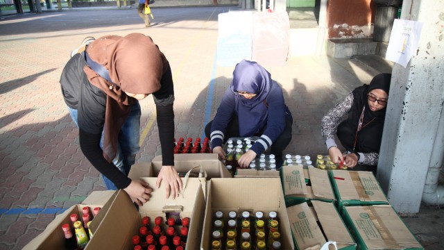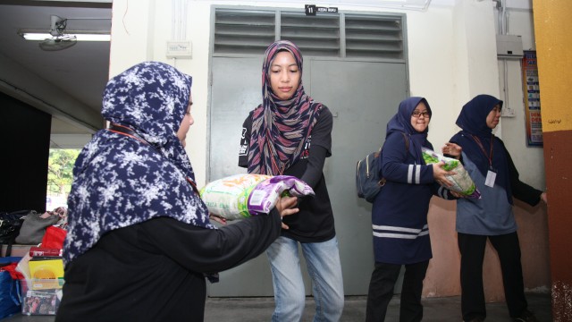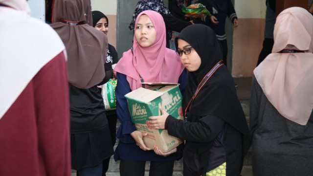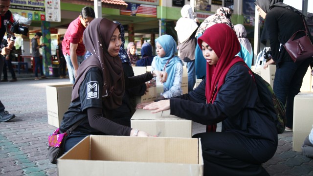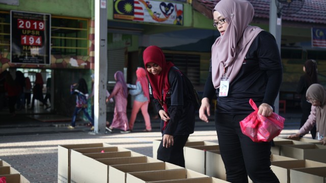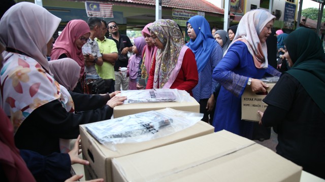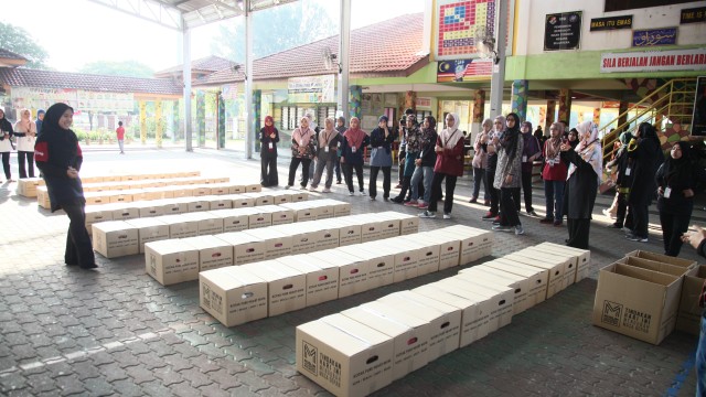Kemudian, jam 12.00 tengah hari, ibu bapa sudah mula beratur di perkarangan dewan terbuka sekolah tersebut bagi pengagihan kotak Pure Heart yang berisi barangan asas dapur.