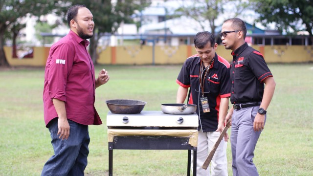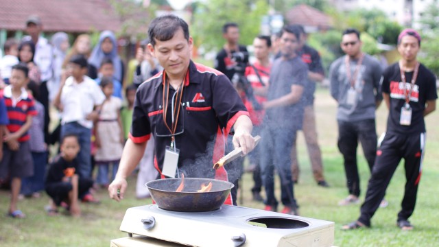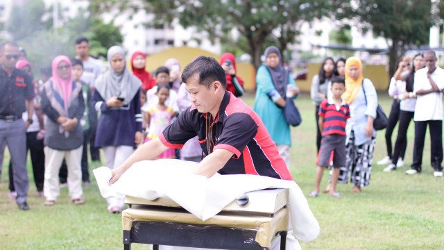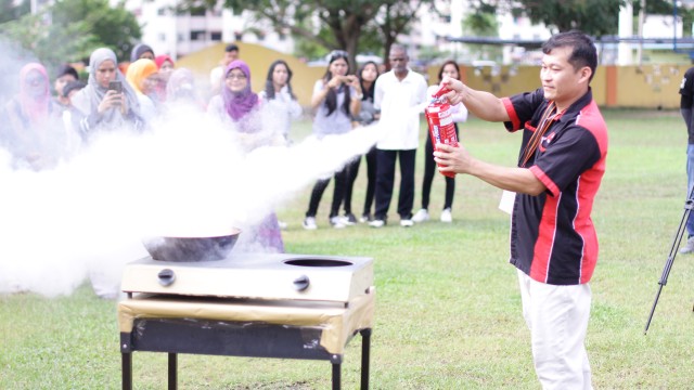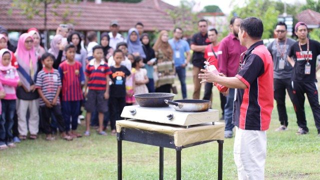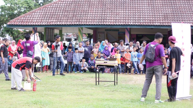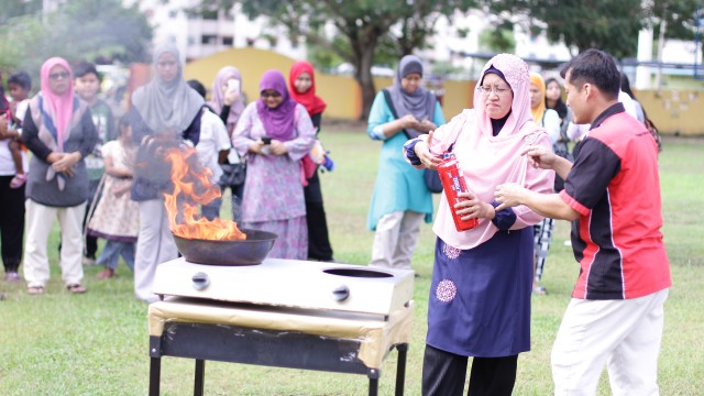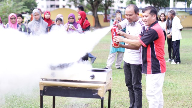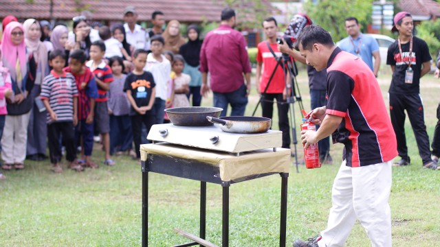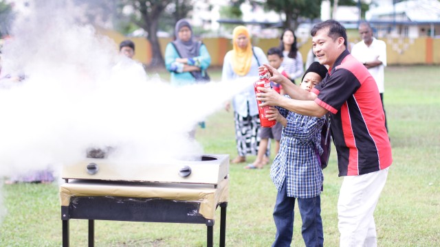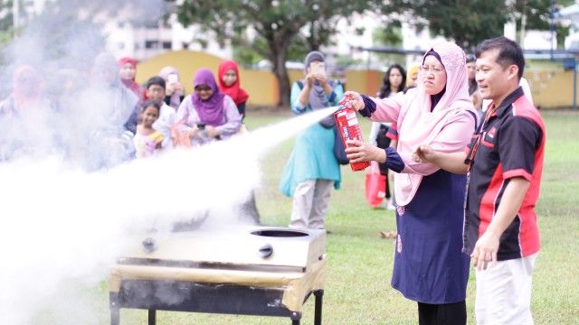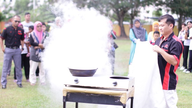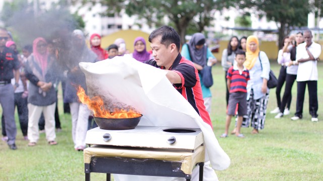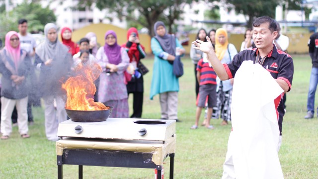 Pada slot demonstrasi pula, pihak Aito Fire Work menunjukkan cara-cara memadamkan api menggunakan alat pemadam api dan selimut anti api.