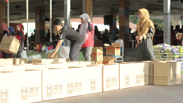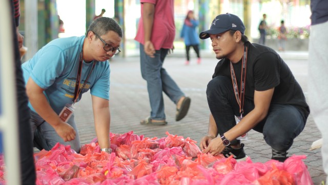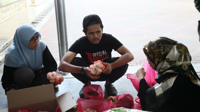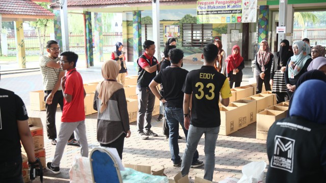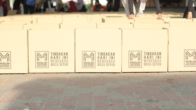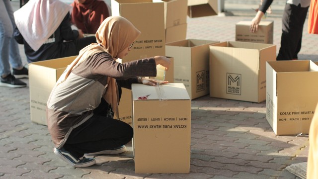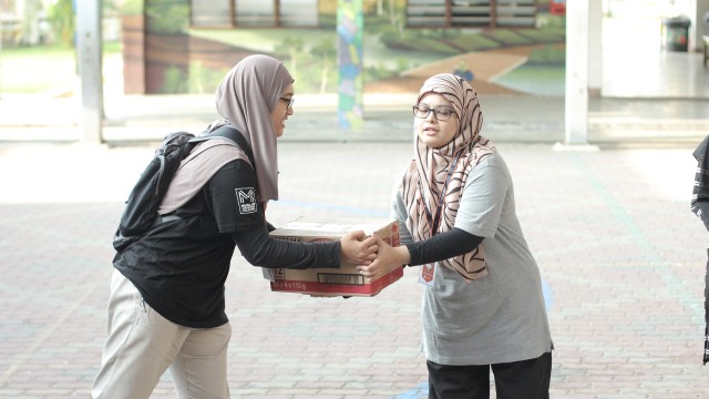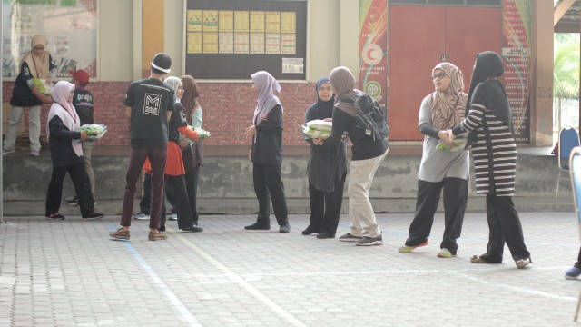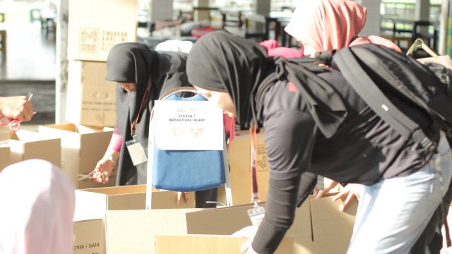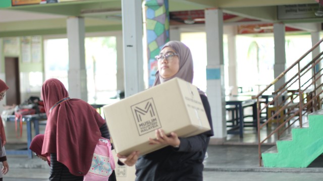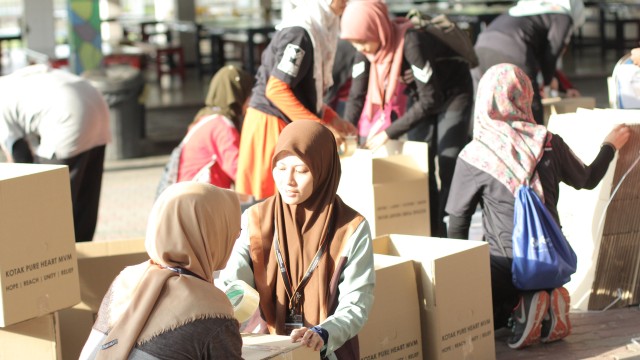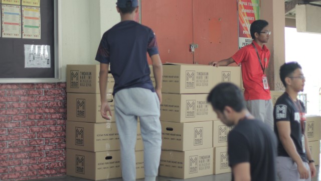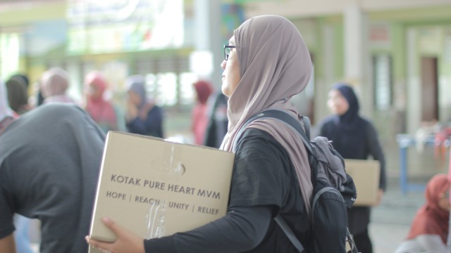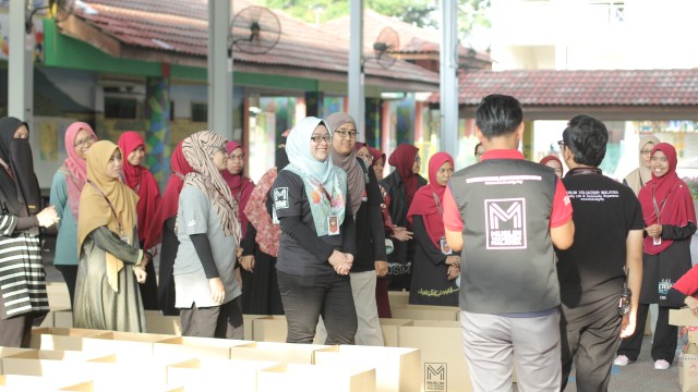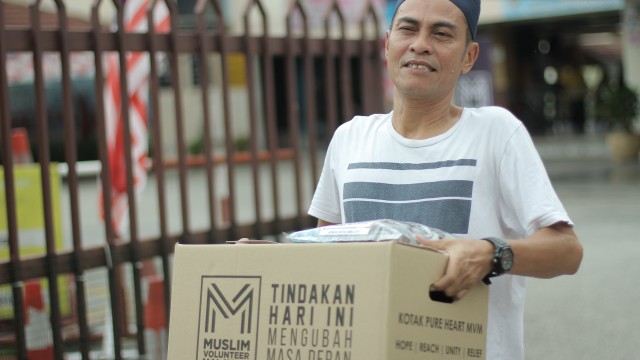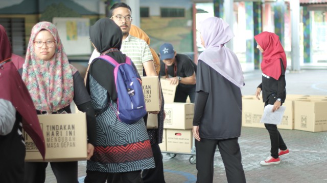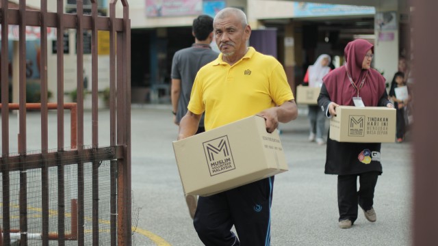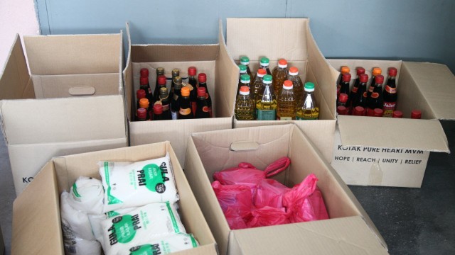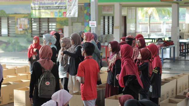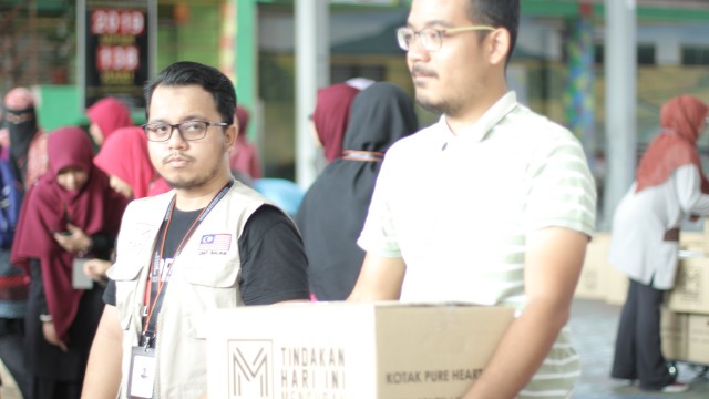 Kemudian, jam 12.00 tengah hari, ibu bapa sudah mula beratur di perkarangan dewan terbuka sekolah tersebut bagi pengagihan kotak Pure Heart yang berisi barangan asas dapur.