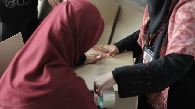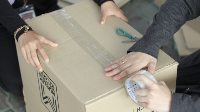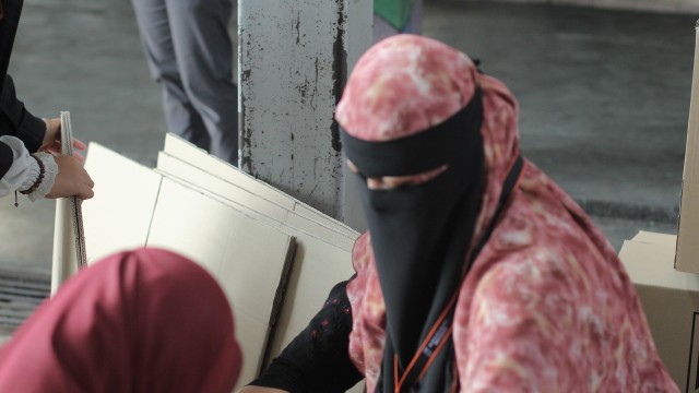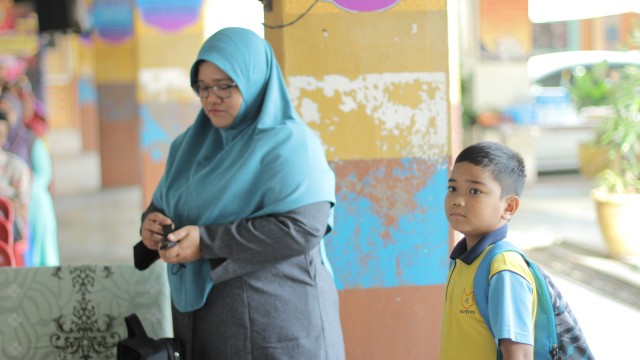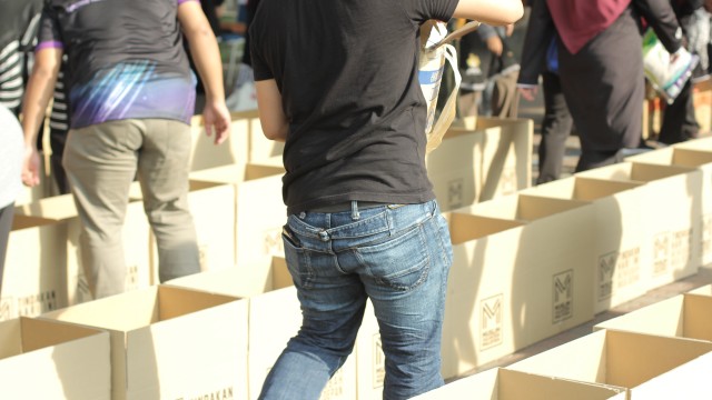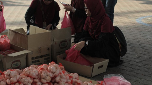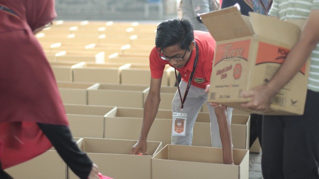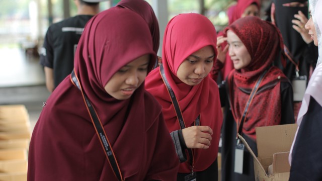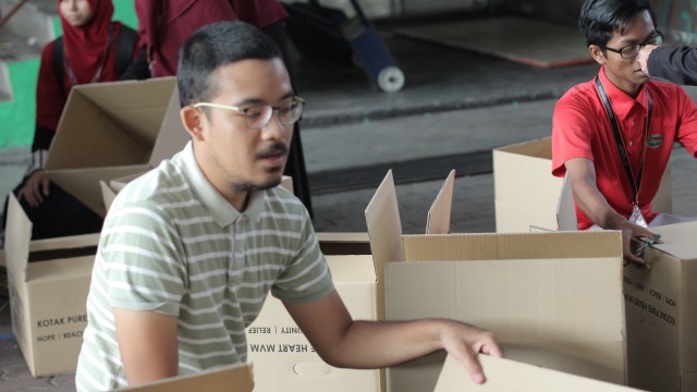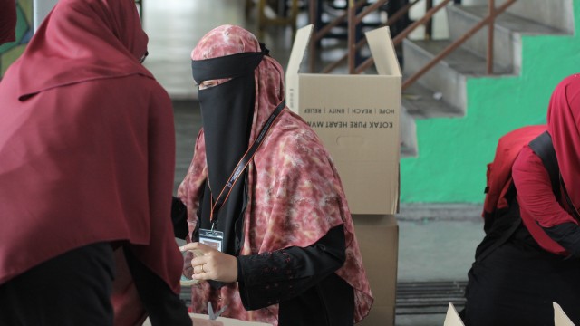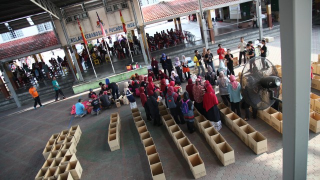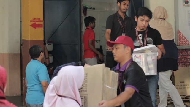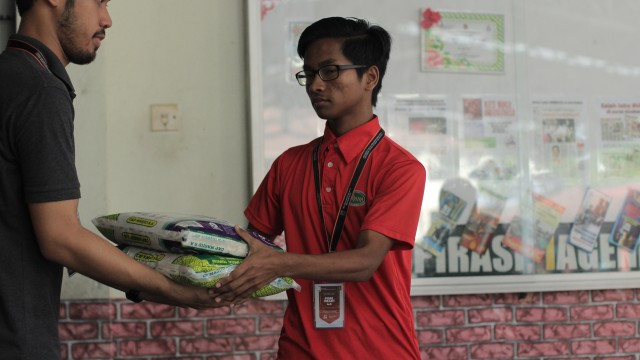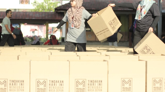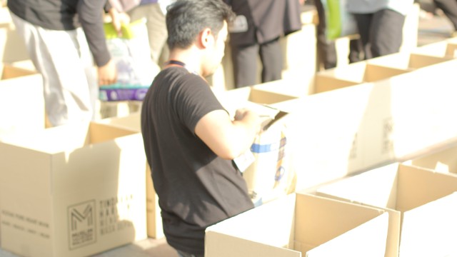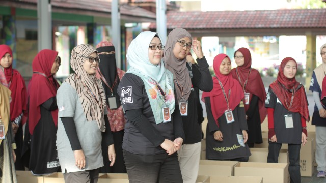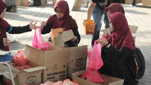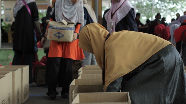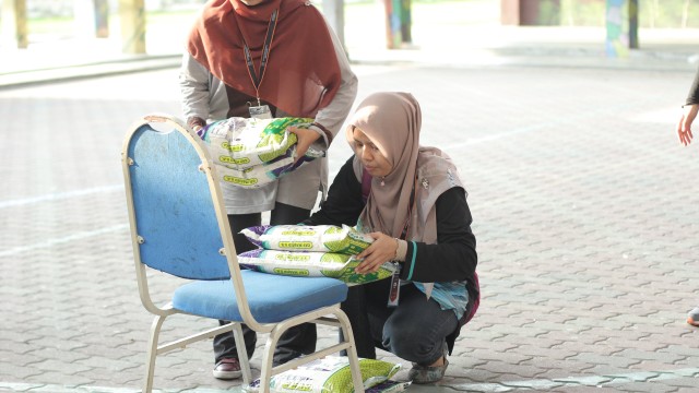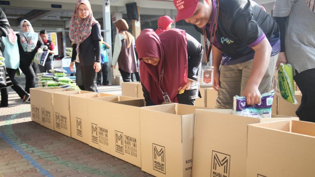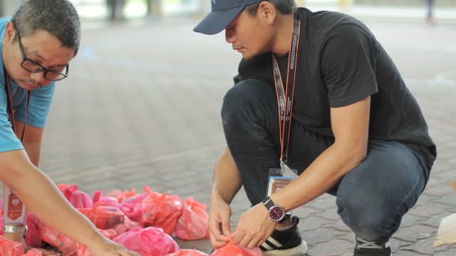 Kemudian, jam 12.00 tengah hari, ibu bapa sudah mula beratur di perkarangan dewan terbuka sekolah tersebut bagi pengagihan kotak Pure Heart yang berisi barangan asas dapur.