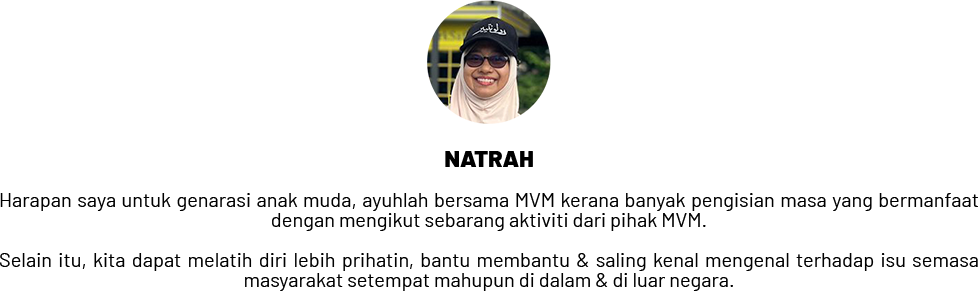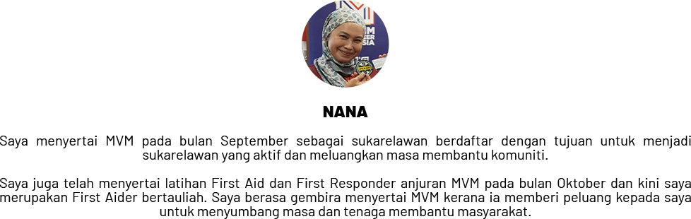 Saya menyertai MVM pada bulan September sebagai sukarelawan berdaftar dengan tujuan untuk menjadi sukarelawan yang aktif dan meluangkan masa membantu komuniti.